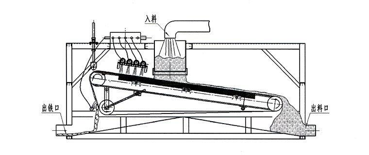 平板式磁選機(jī)(平板除鐵器),包括機(jī)架,機(jī)架上設(shè)有磁選機(jī)構(gòu)、張緊機(jī)構(gòu)、供水系統(tǒng)和勻料裝置,勻料裝置位于磁選斜面的低側(cè)與供水系統(tǒng)之間的輸送帶部分的上方,勻料裝置包括上下設(shè)置的勻料層,每個(gè)勻料層包括帶落料網(wǎng)孔的底部和設(shè)在底部周邊的擋料板,落料網(wǎng)孔均勻分布在勻料層的底部,擋料板首尾連接圍成接料口,落料網(wǎng)孔的孔徑與礦料的大小相應(yīng)的勻水裝置,包括位于磁選斜面的上方與沖料進(jìn)水管相接的噴淋管,噴淋管的正下方設(shè)有底部帶均勻通水孔的淋水器,噴淋管向下開有若干噴淋孔。