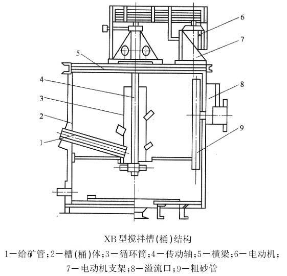 攪拌槽由豎軸部、架子、桶體部、溢流口、電動機、電動機座、電動機座組成。葉輪的旋轉(zhuǎn)是由電動機通過皮帶輪、三角帶而得到葉輪的旋轉(zhuǎn)使礦漿和藥劑攪拌均勻,通過提升裝置從排料斗流出。